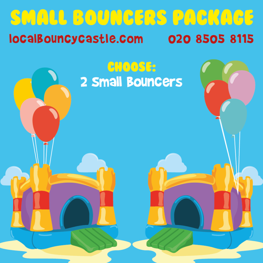 This package makes it even more fun with a 2 small bouncers for your party.