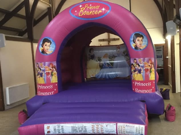 Princess themed bouncy castle, very popular at children's parties. We have all your favourite princesses at the front with a pink and purple colour scheme.