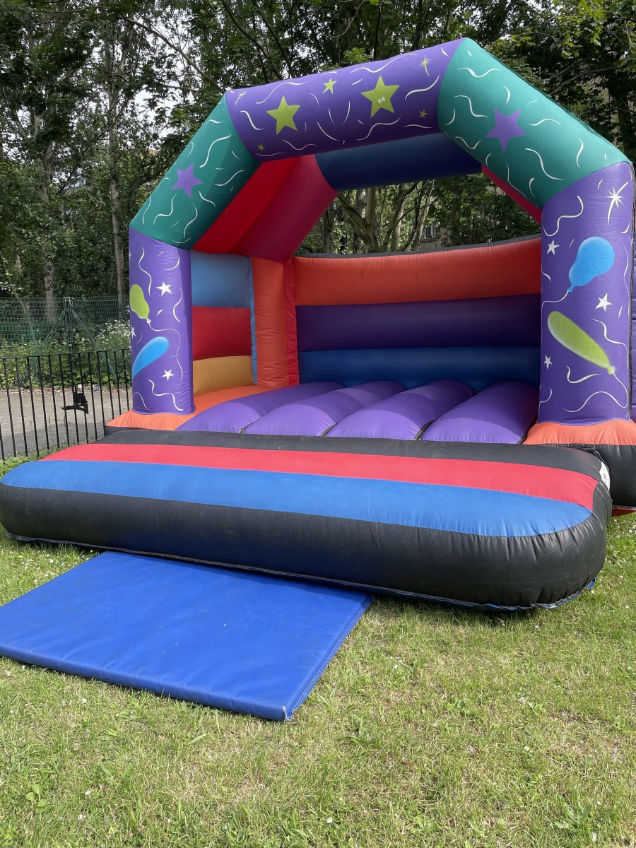 This Party Time Bouncy Castle is very popular at children's parties and occasions of any kind. With reinforced seams , built in shower cover and a mesh netting at the back of the castle as an added safety feature. The front panels feature images of Party Balloons.This inflatable has been the highlight of many parties in and around East London. Availability is limited as bookings are often made a few weeks in advance, so we advise you call early to avoid disappointment!